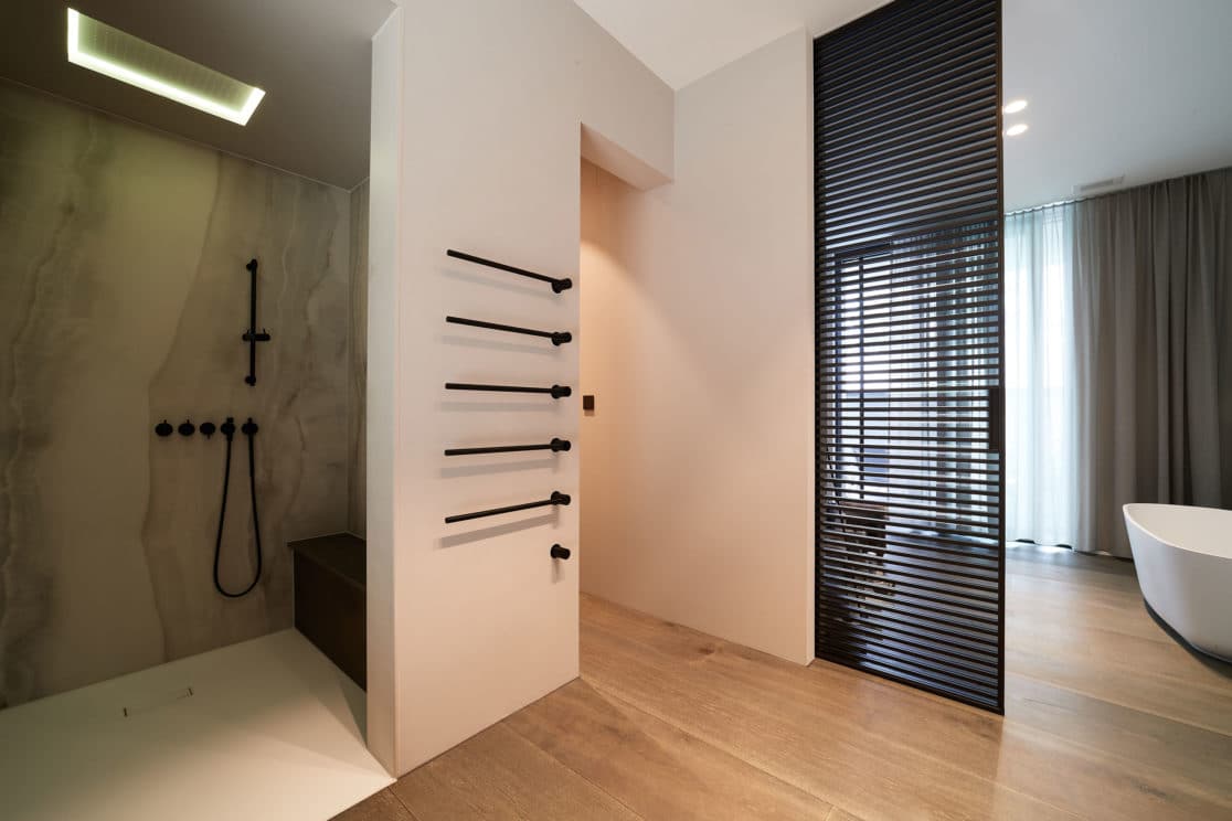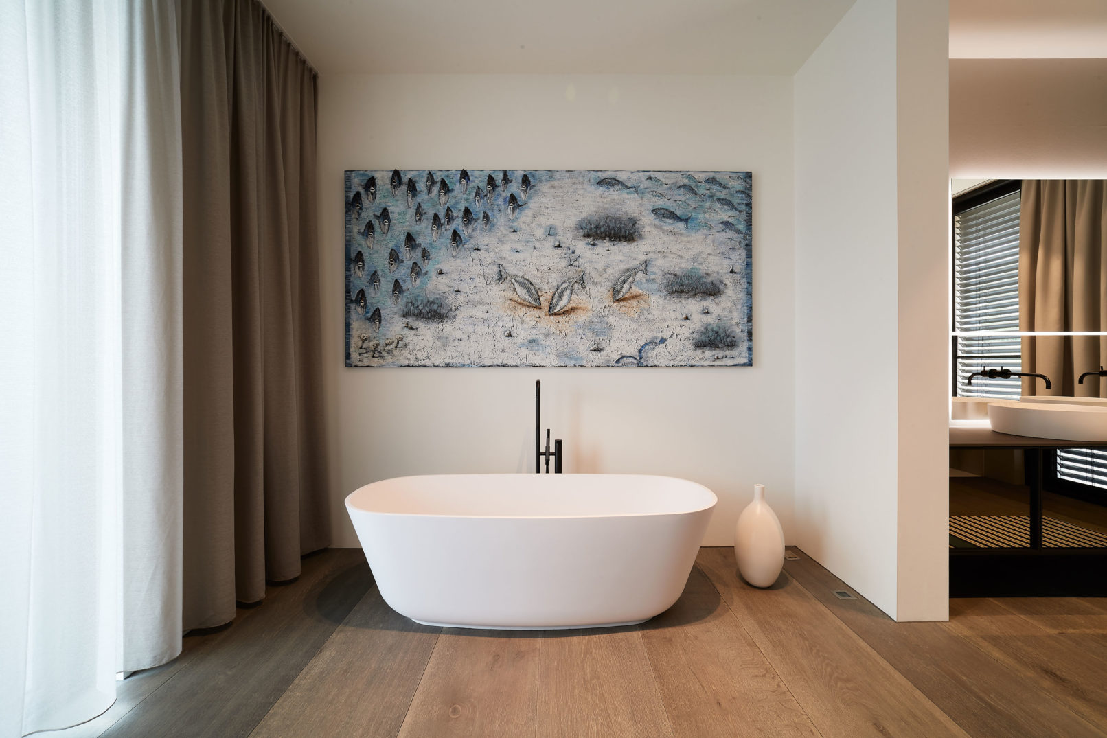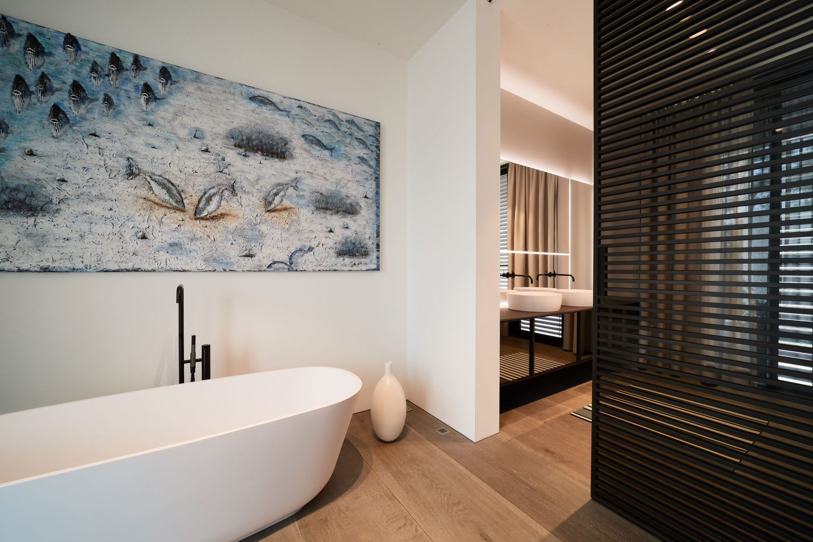 Moderne und minimalistisch klare Formen treffen auf puren Luxus. Highlight ist die freistehende Badewanne im Schlafzimmer dieses großzügigen Familienbades.