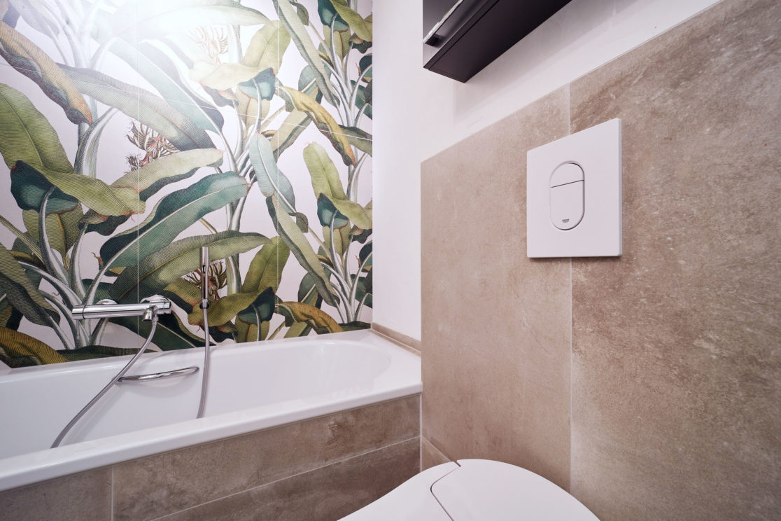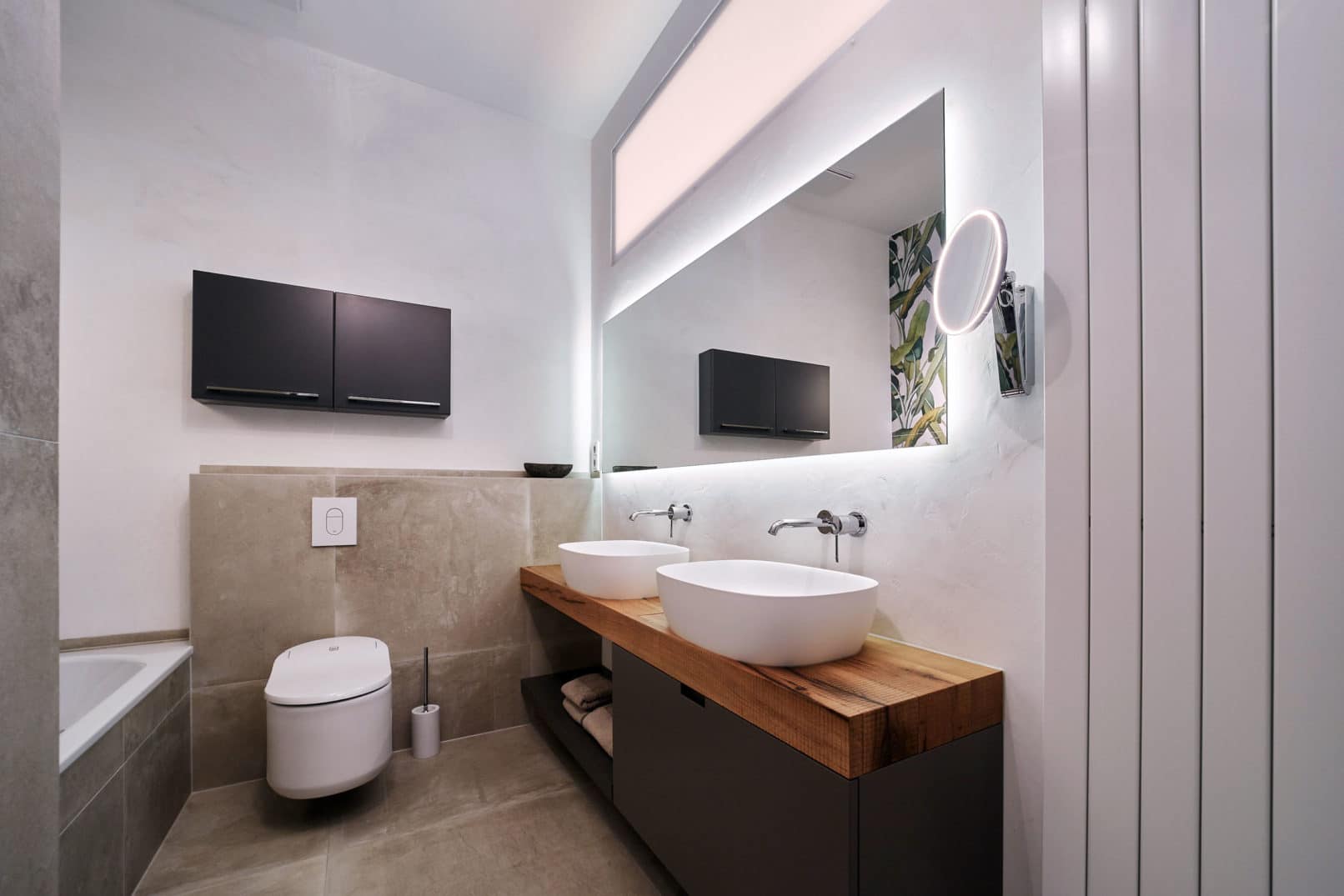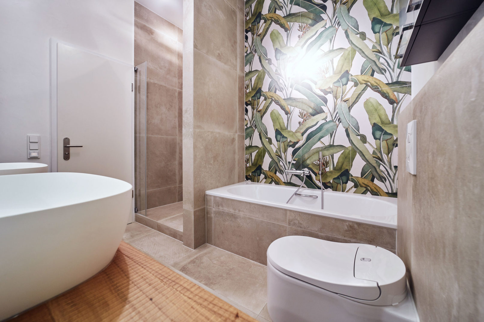 Mittelgroßes Modernes Badezimmer mit Einbaubadewanne, Dusch WC SENSIA, Feinsteinfliesen Boden + Wand, Motivfliese über der Badewanne, Volimea Wandputz, Waschplatz mit Aufsatzwaschbecken aus Flumood matt, Top aus Old Wood.